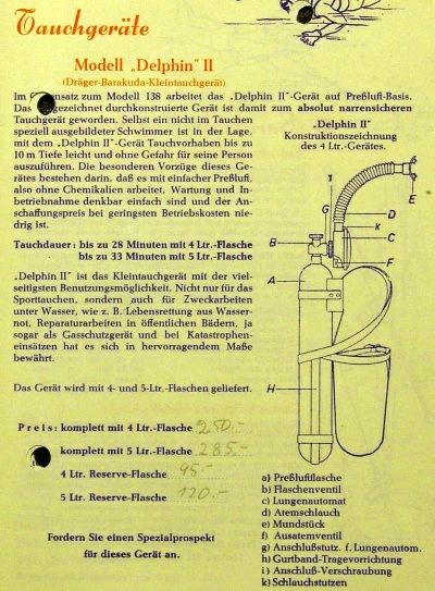Together with the Dräger company, Barracuda distributed the first German self-contained diving – the Dräger Delphin II monohose. Therefore, the Barakuda started selling equipment from La Spirotechnique, Cressi, Mares and Nemrod.