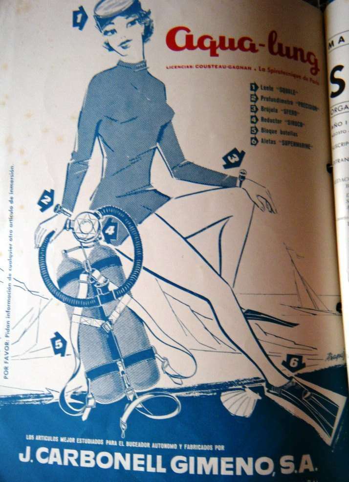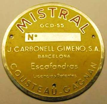 J. CARBONELL GIMENO from Barcelona, contemporary of Nemrod, which apart from classic diving helmets also developed diving regulators such as the Siroco double hose regulator, Mistral double hose regulator, diving fins, speargums, gauges, scooters, valves, etc.