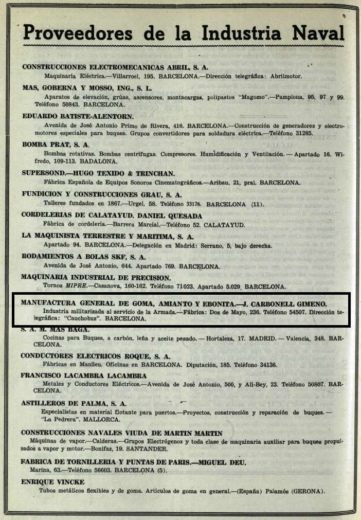 The supplier of standard diving equipment to the Spanish Navy, was Joaquin Carbonell Gimeno, S.A. from Barcelona. It is believed that he manufactured diving helmets for the navy since the early nineteen forties. Somewhere in the nineteen fifties he became importer and dealer for La Spirotechnique.